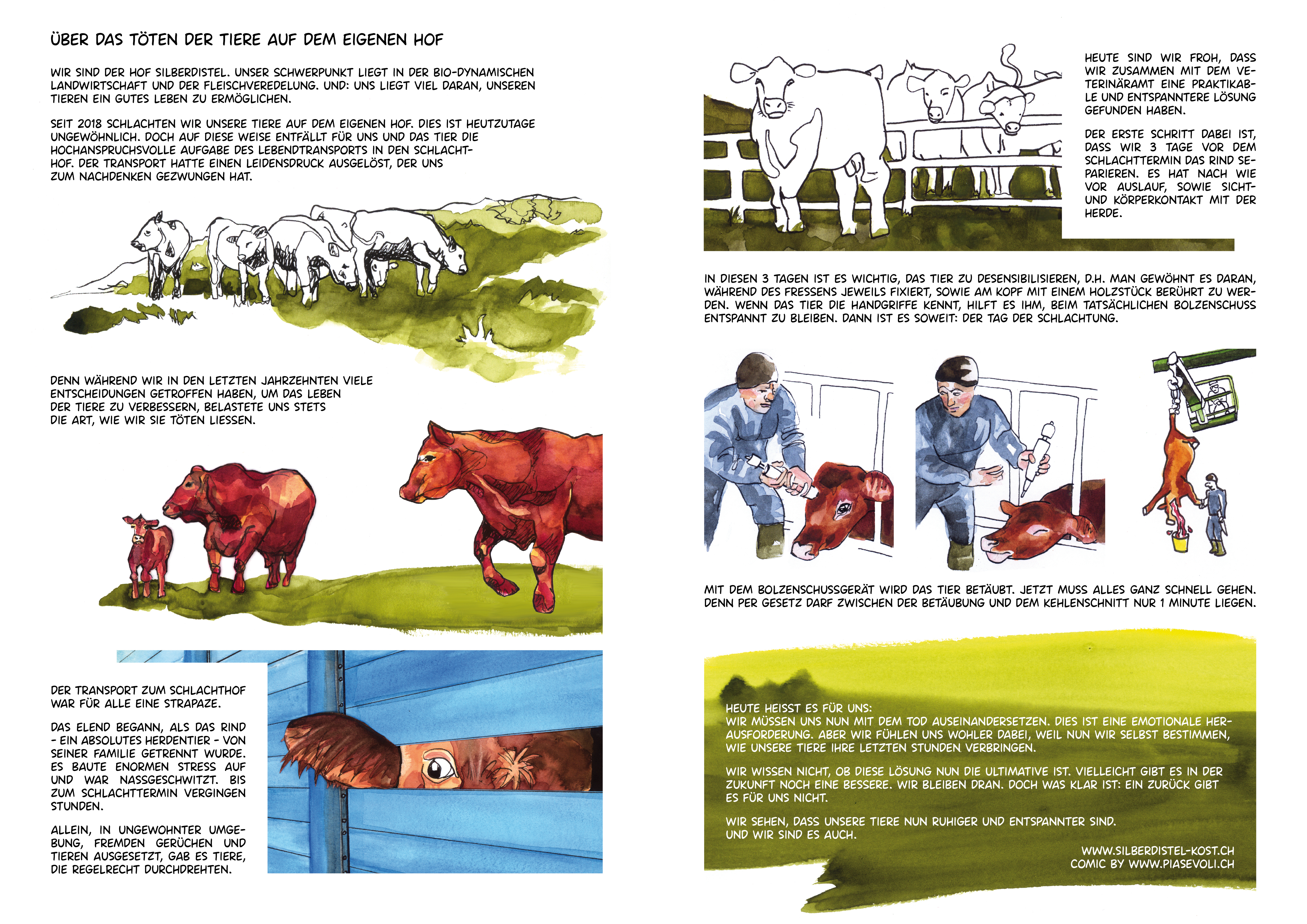 Wir haben eine für uns ideale Form gefunden die Schlachtung auf dem Hof zu Illustrieren. Die Schlachtung unserer Rinder ist für uns ein sehr intimer Moment den wir nicht via Videoaufnahme präsentieren möchten. In der gezeichneten Form können wir die Herausforderungen ansprechen und die Bildsprache wirkt subtil.